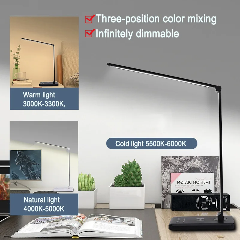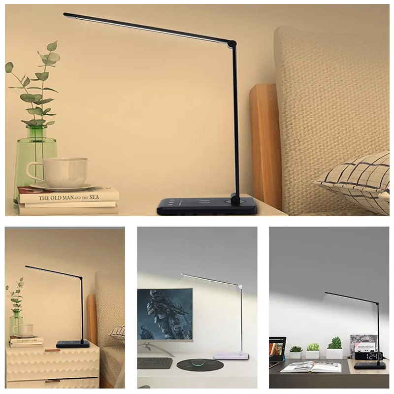 This folding wireless charging desk lamp has a wide range of applications, eye protection reading, reading work lighting, night market nail art embroidery dimming desk lamp, bedside bedroom living room lighting mobile phone charging and other uses.
